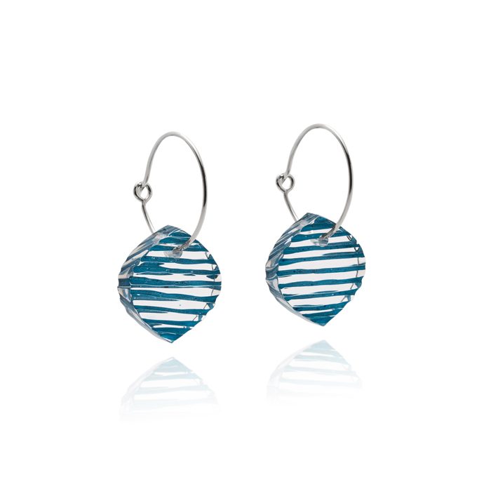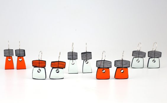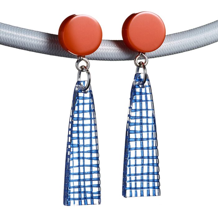 Sarah endeavours to push the boundaries of what can be done with her chosen material. She experiments with textured surface patterns and innovative ways of joining components. Many of her designs have hand etched lines on clear acrylic which are dyed in a hot dyebath using Disperse dyes. They are finished by polishing back to reveal the coloured pattern. Sarah uses a laser cutter, scroll saw or bandsaw to cut out shapes from sheet acrylic, and hand makes all her ear wires in silver. All designs are highly finished to give a precious feel.