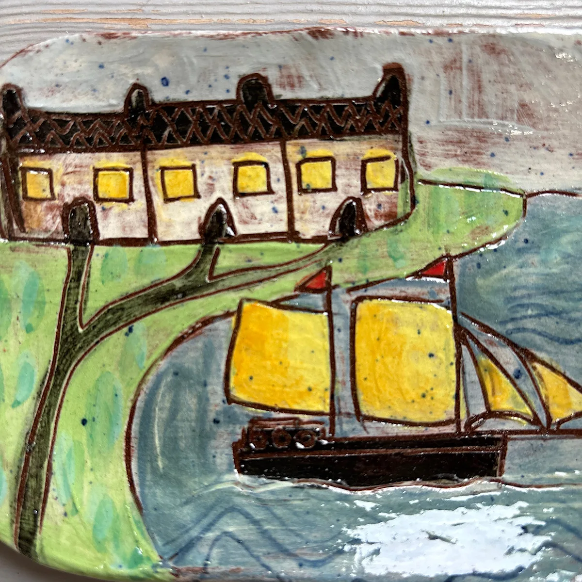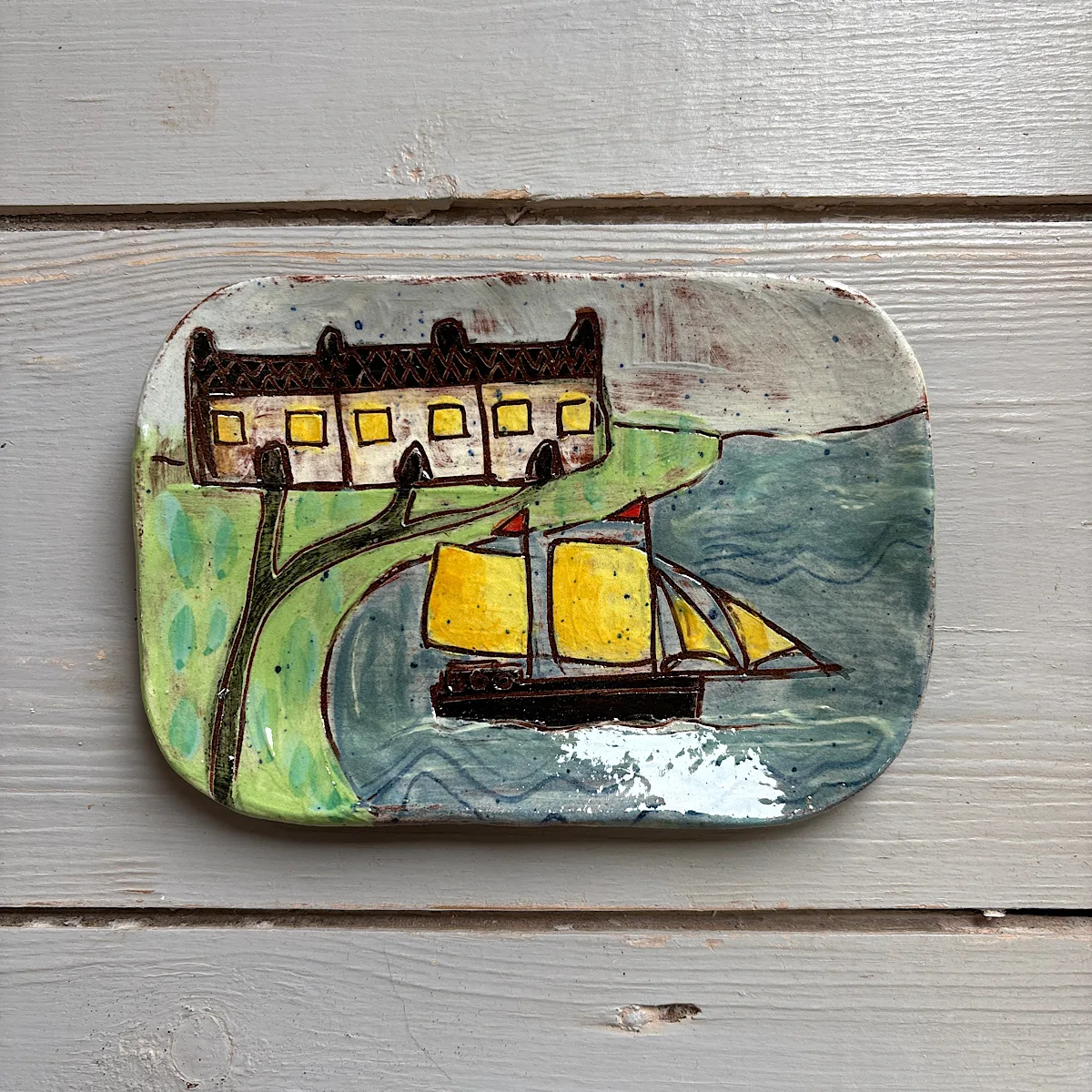 This postcard plate is a unique and individual artwork, handpainted with slips and glazes using the sgraffito technique. Collectable and tactile.