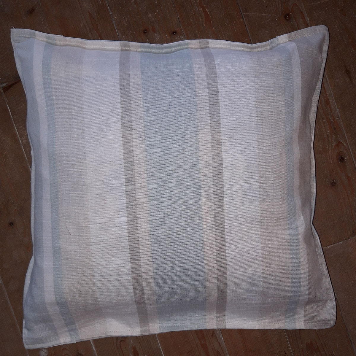 Crab cushion with a cream, pale aqua and beige striped border and back. Linen and cotton ground with appliqué.