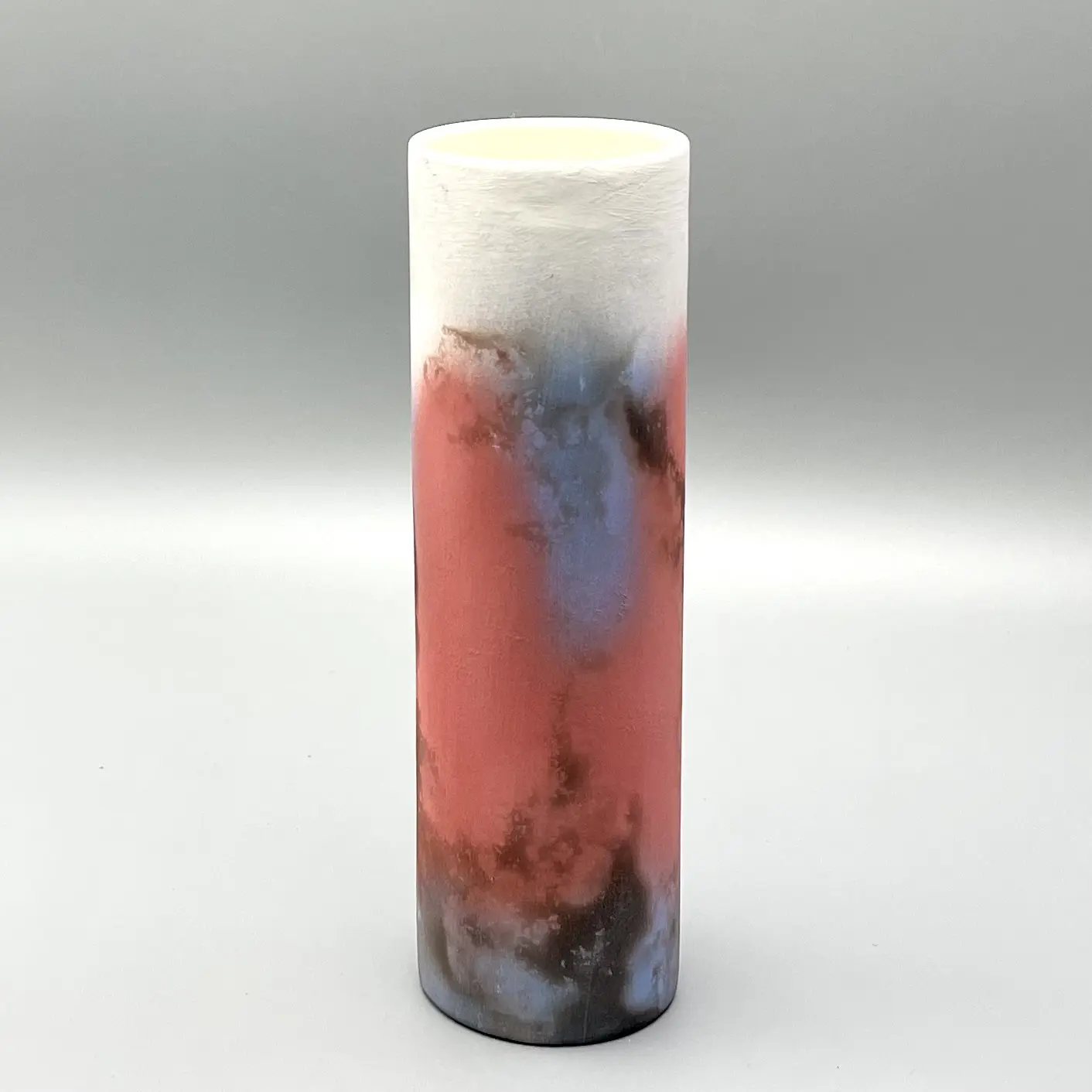 Slips are sprayed onto the surface followed by a controlled smokefiring. The image is representative, as there is more than one vase available.No two smokefired pieces can be identical. Tessa has signed the base of the pot.