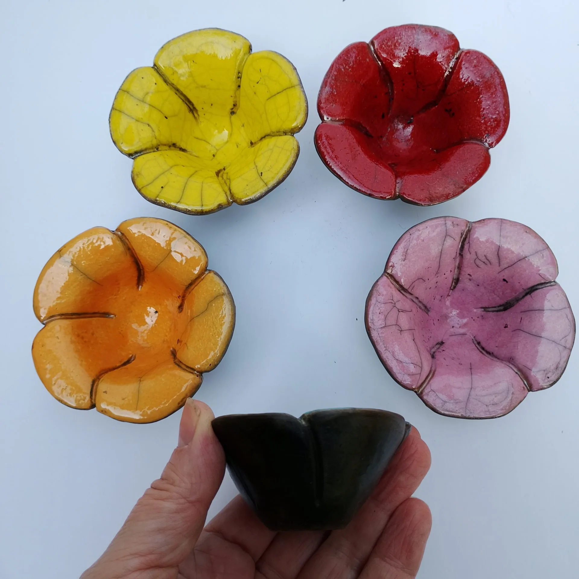 These small flower bowls have been fired using the Raku process where pieces are placed in an outdoor kiln, heated to 960c and plunged into sawdust creating the characteristic crackling and smoked effect. For this reason each piece is unique.