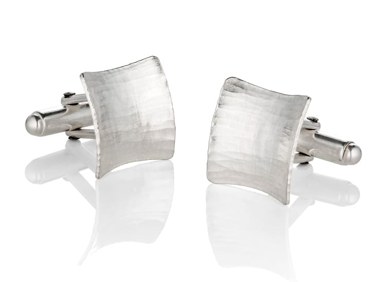 A pair of square-outline, subtly three-dimensional cufflinks, made by anticlastic raising from sterling silver.